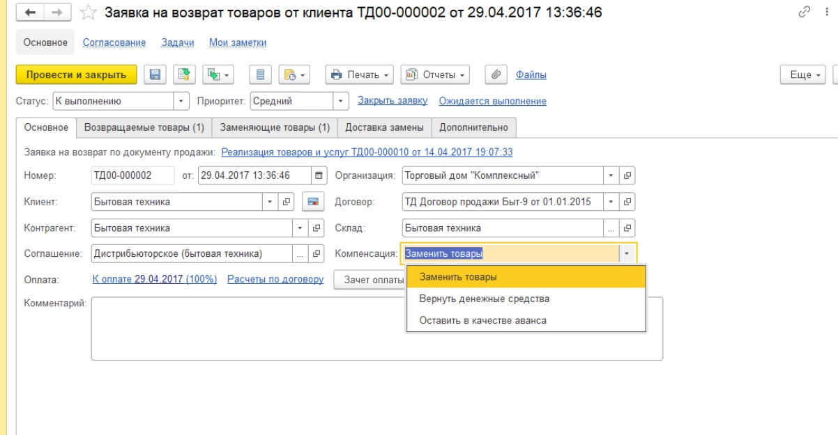 Если претензии не было, но клиент хочет вернуть товар, на основании исходного документа реализации создается «Заявка на возврат», где можно зафиксировать информацию о возвращаемом товаре и последующие действия по возврату (замена товара, возврат денежных средств и пр.).