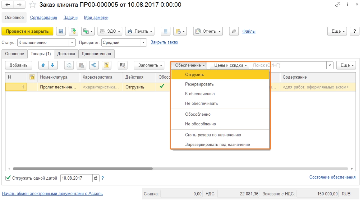 Пока товара нет на складе, ему можно назначить статус «Обеспечить», тогда у сотрудников отдела снабжения появится информация о потребности к закупу указанных позиций товара. Когда товар поступит на склад, его можно будет зарезервировать под конкретный заказ и нельзя отгрузить на другие нужды.