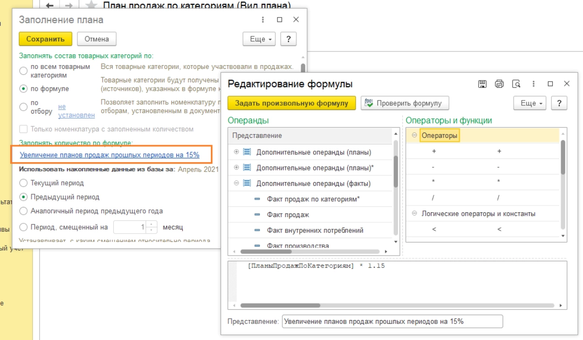 Основные параметры заполнения планов задают в «Сценариях планирования» и «Видах планов». Есть несколько вариантов автоматического заполнения планов, например, по формулам, на основе статистических объемов продаж прошлых лет, согласно источникам планирования (документ «Заказ клиента») или на основе других планов продаж.