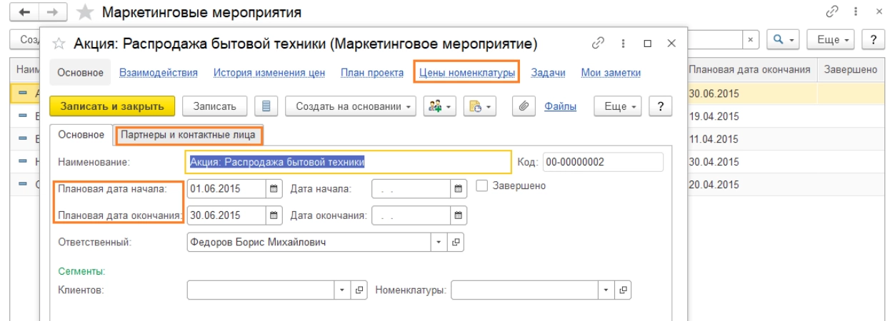 В карточке «Маркетингового мероприятия» существует возможность задать основные параметры акции: