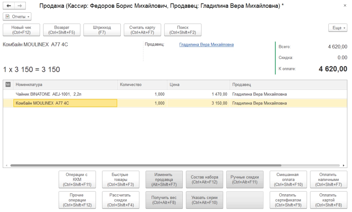 - Автоматизированное место кассира позволяет фиксировать операции розничных продаж в системе с возможность получения чеков ККМ и применения бонусных программ и карт лояльности.