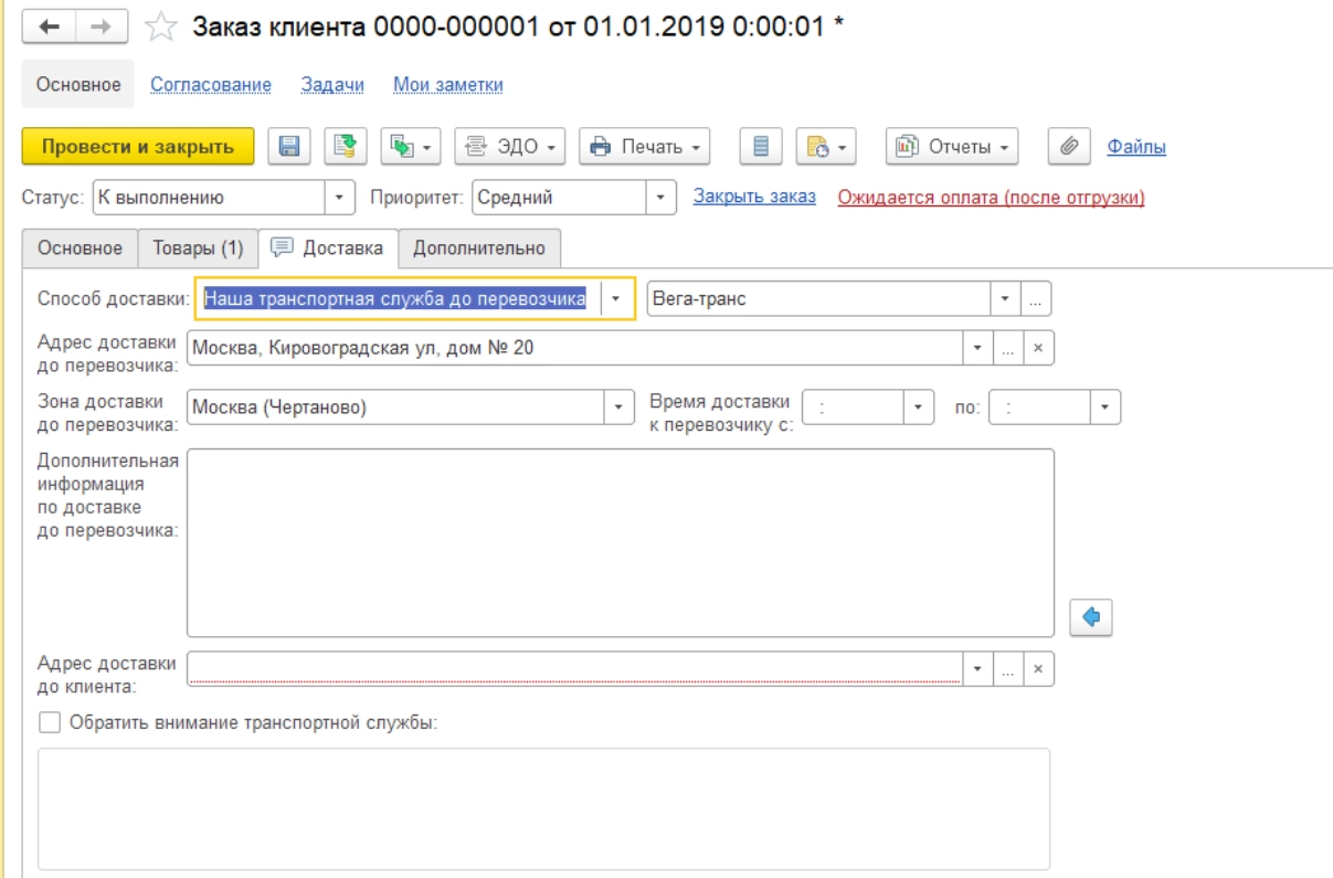 - Условия доставки, где можно указать различные варианты доставки (например, самовывоз, транспортная служба и пр.), на основании чего автоматом будет сформировано распоряжение в службу логистики.