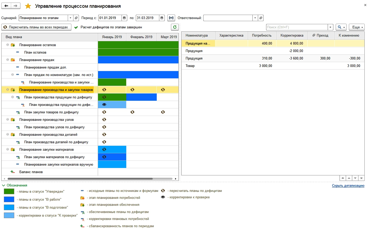 Объемно-календарное планирование автоматизирует планирование на основании планов продаж, объемов производства и материалов к закупу. Централизованное управление процедурой планирования осуществляется из АРМ «Управление процессом планирования». Здесь можно оформлять и пересчитывать планы, а этапы планирования назначать в сценариях планирования.