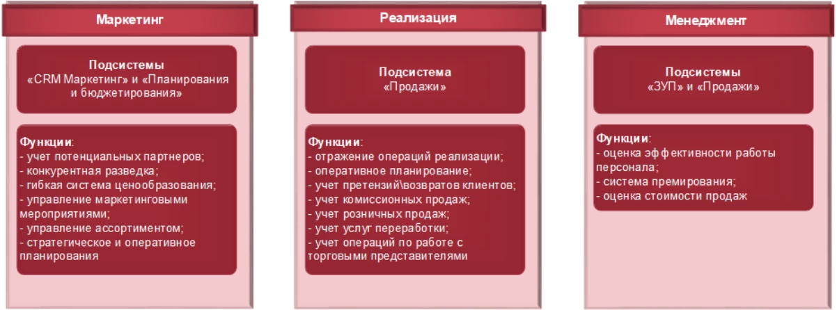 Прикладное решении 1С:ERP позволяет автоматизировать большинство функциональных областей раздела учета «Управления продажами» – и всевозможные варианты самого процесса торговли (оптовые продажи, розница, учет возвратов и претензий, комиссионные продажи), и дополнительные опции (объемно-календарное планирование, резервирование, обеспечение потребностей.). Также в 1С:ERP есть целый раздел для автоматизации процессов «Маркетинга» – работы с потенциальными клиентами, ценообразования, долгосрочного и среднесрочного планирования и пр. Даже для целей «Менеджмента» предусмотрены отдельные инструменты. Таким образом, внедрив систему 1С:ERP, торговое предприятие получает комплексный инструмент управления продажами, методология которого сама по себе способна скорректировать процесс продаж в сторону роста и оптимизации.