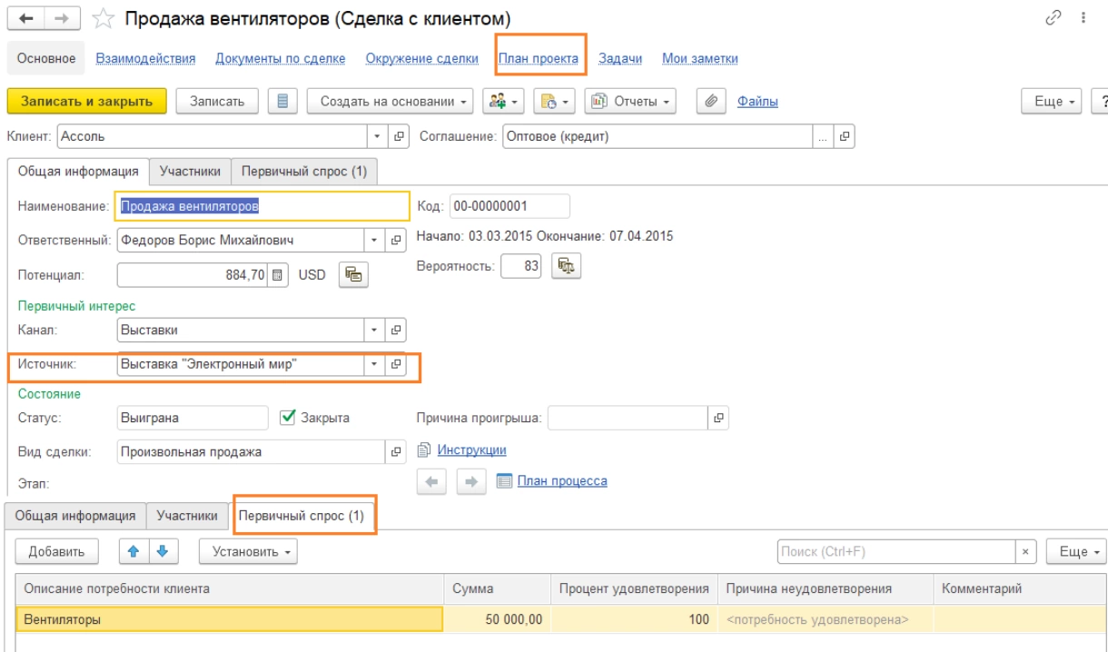 Для целей обособления хозяйственных операций под определенные мероприятия предусмотрен объект «Сделка». Используя его, можно зарегистрировать все этапы работы с клиентом в рамках конкретного мероприятия (этапы процесса продаж), начиная с регистрации потенциального клиента до отгрузки товаров клиенту (успешное завершение сделки). Документ позволяет задавать этапы исполнения сделки (мероприятия), участников сделки и первичный спрос по ней.