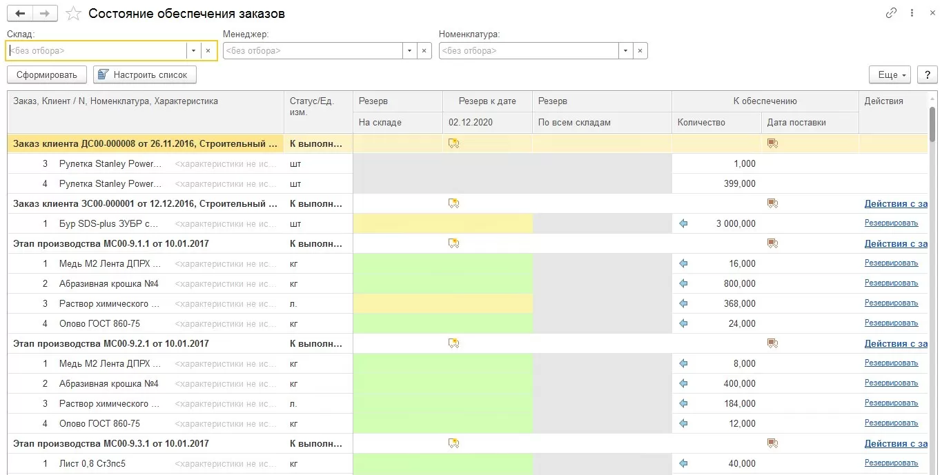 Для осуществления контроля обеспечения заказов необходимыми материалами и изделиями в системе предусмотрено специальное рабочее место «Состояние обеспечения заказов». В нижней части данного рабочего места предусмотрено описание обозначений, используемых в основном окне. В окне состояния обеспечения заказов используется цветовая дифференциация для визуализации состояния заказа, а также отображаются рекомендации для всего заказа и для отдельных его строк.