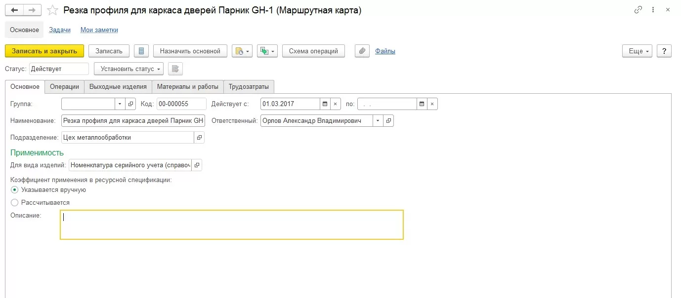 Для маршрутных карт также используются статусы, применять можно только маршрутную карту со статусом «Действует». Маршрутную карту в статусе «Закрыта» использовать нельзя, а при необходимости внесения в нее каких-либо правок ее нужно перевести в статус «В разработке». Для маршрутной карты задается период, в который она считается действительной.