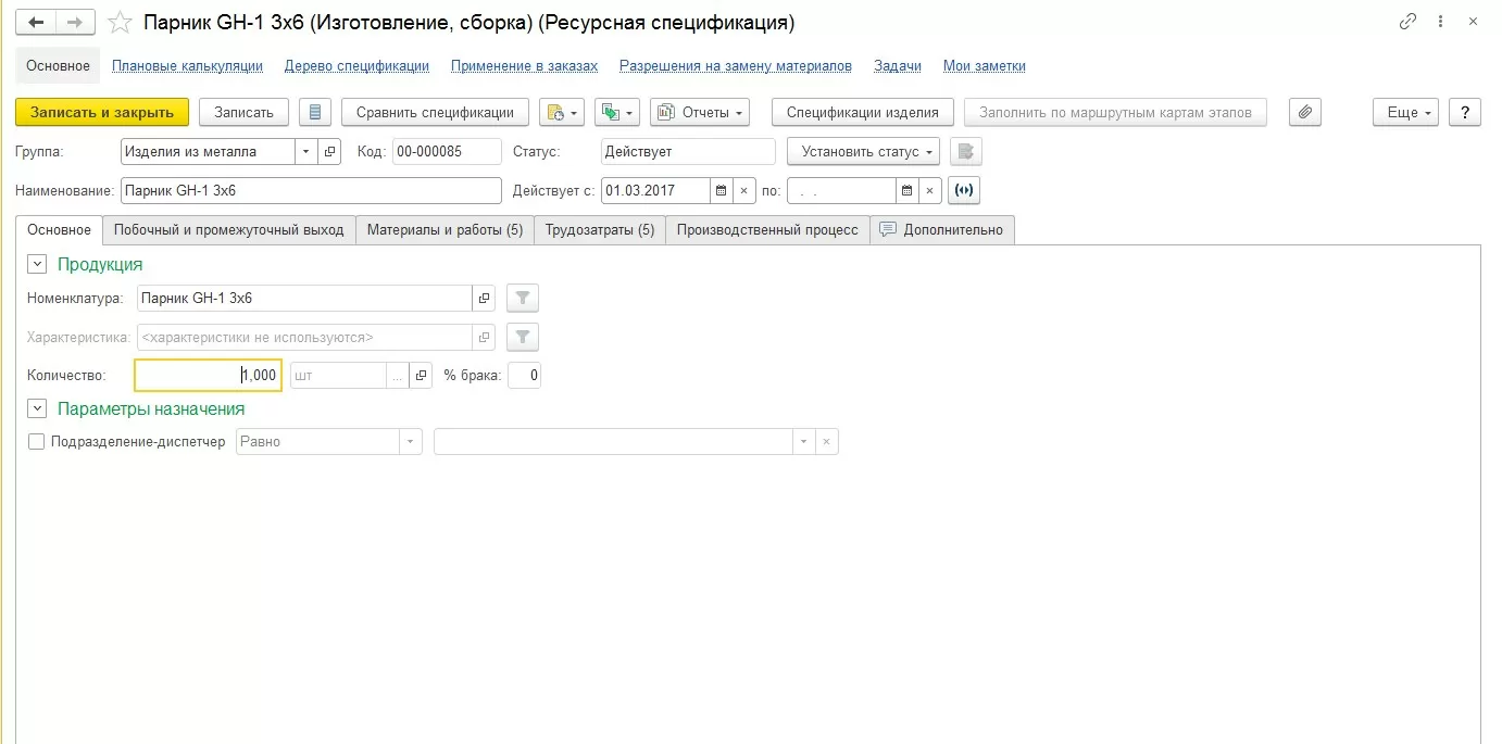 Также она имеет несколько статусов. Работать в процессе изготовления можно только со спецификацией со статусом «Действует», а вносить изменения допускается в статусе «В разработке». Спецификации, имеющие статус «Закрыта», недоступны для использования.