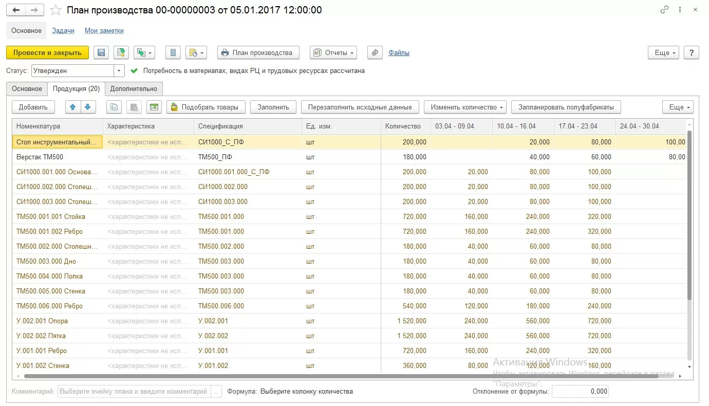 На вкладках «Продукция» и «Полуфабрикаты» указываются изделия и полуфабрикаты, которые планируются к производству, их количество, а также спецификации, которые будут использоваться в процессе выпуска. По планам производства оценивается необходимость осуществления закупок сырья и материалов, а также привлечения трудовых ресурсов.