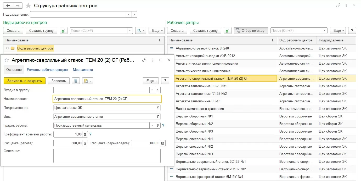 В системе допускается настраивать составляющие рабочих центров, которые представляют производственные мощности участков. В справочнике «Рабочие центры» описываются станки, машины, установки, которые используются организацией в процессе изготовления. Рабочие центры объединяются в группы — виды. В видах можно задавать аспекты планирования работы техники и управлять доступностью. Для видов рабочих центров настраивается максимальная доступность одного рабочего центра для исполнения одного этапа изготовления.