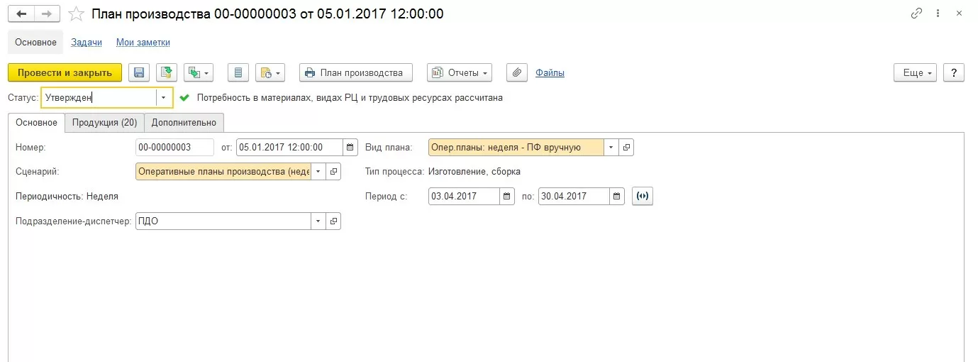 Кроме настройки сценария на вкладке «Основное» также указывается вид плана, который фиксирует настройки заполнения документа, период, на который оформляется план, и ПДО – подразделение-диспетчер, которое является ответственным за выполнение данного плана. Для плана производства имеется возможность определить его текущий статус.