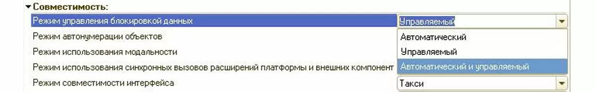 - В первую очередь нужно изменить режим управления блокировкой данных для конфигурации. Для этого в конфигураторе откройте дерево конфигурации и в свойствах корневого элемента в разделе «Совместимость» измените режим. Выберите пункт «Автоматический и управляемый», чтобы не возникало ошибок до того, как все объекты будут переведены на новый режим;