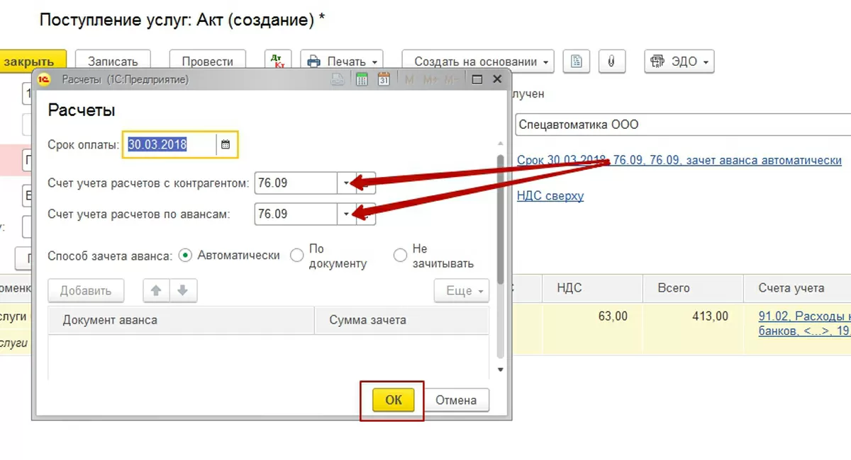 Изменим счета расчетов, т.к. по умолчанию нам предложили использовать 60.01 и 60.02, но нам нужно заменить эти счета на 76.09 «Расчеты с разными дебиторами и кредиторами».