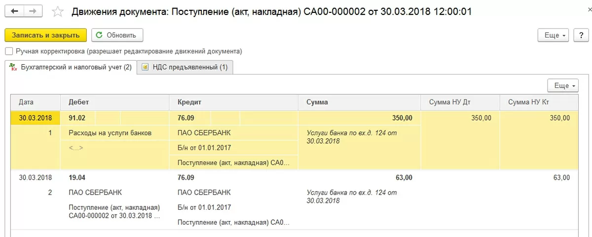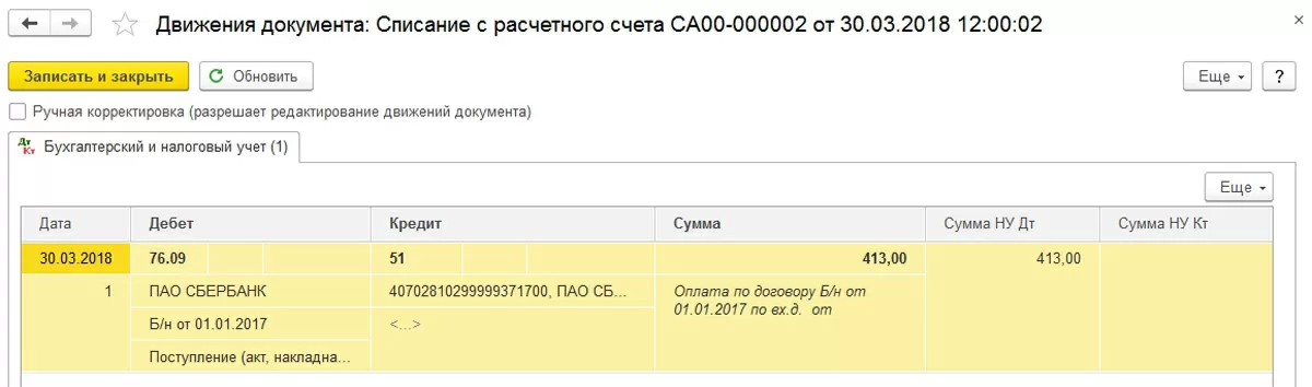После проведения документа убедимся в корректности бухгалтерских проводок.