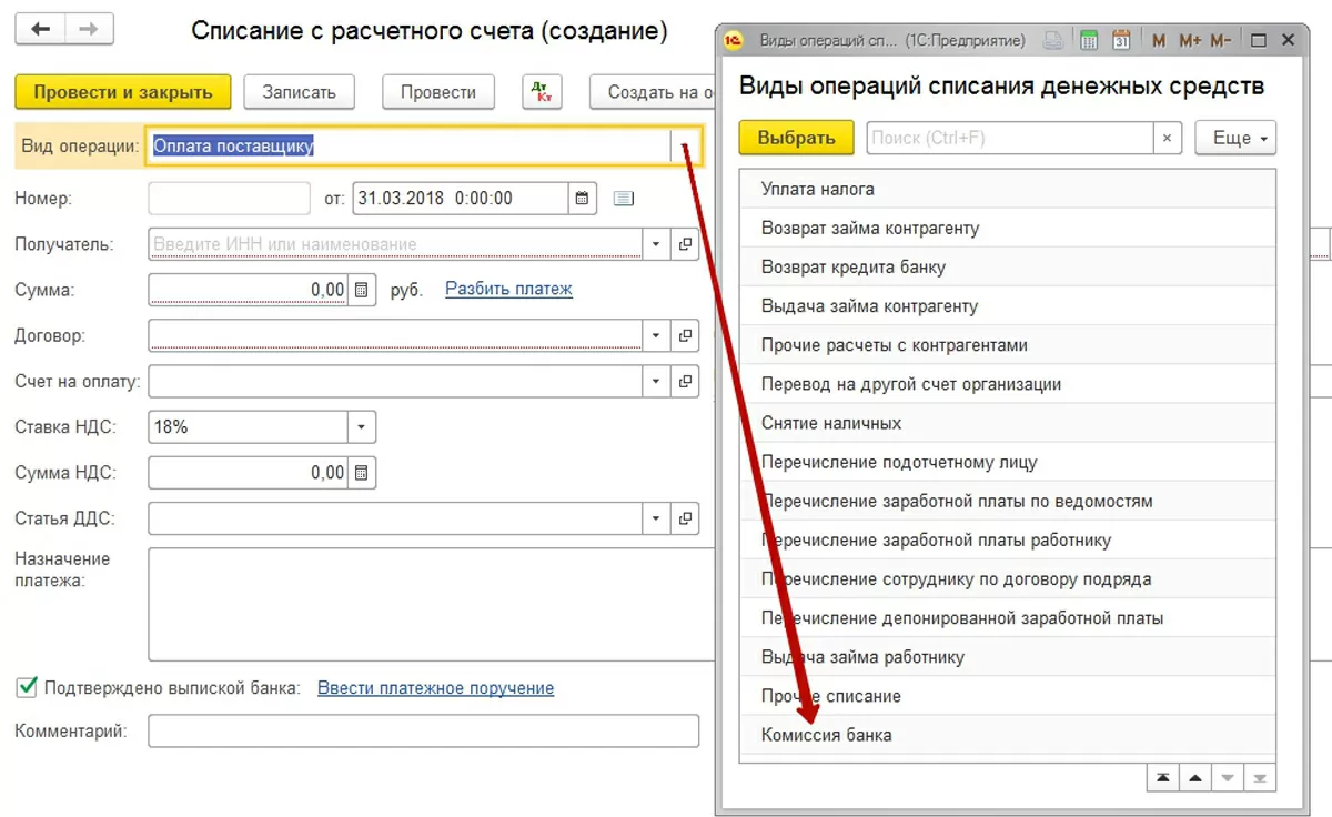 Создадим документ списания и заполним его. Сначала выберем нужный вид операции. По умолчанию будет предложена Оплата поставщику. Выберем из выпадающего списка Комиссия банка (в 1С 8.3).