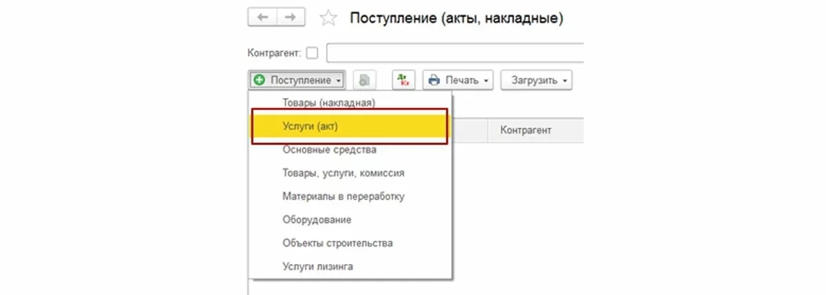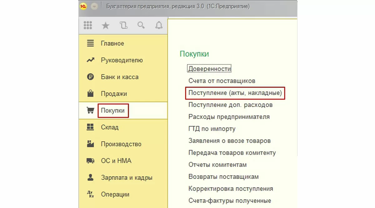 Для регистрации расходов по услугам банка используем документ «Поступление (акт, накладная)» из раздела «Покупки» основного интерфейса системы. Это первый этап действий, чтобы провести комиссию банка, облагаемую НДС.