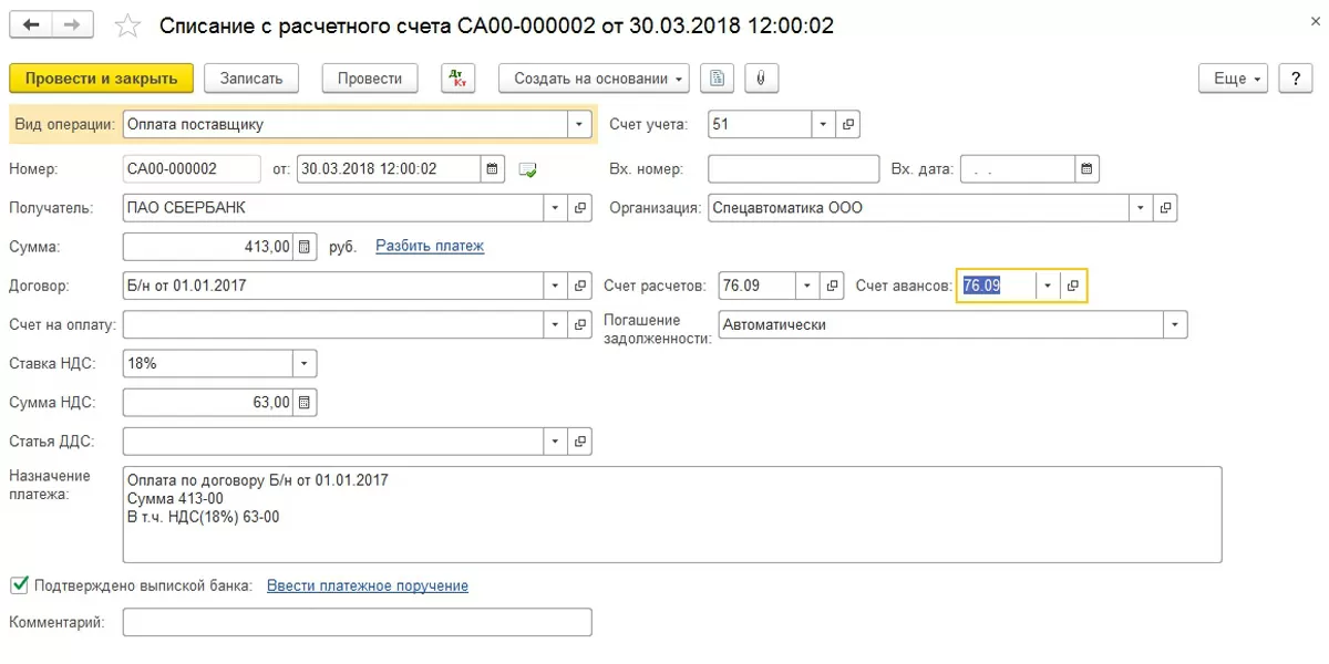 Вторым этапом создадим документ списания с расчетного счета, чтобы закрыть задолженность по счету 76.09, образованную документом поступления.