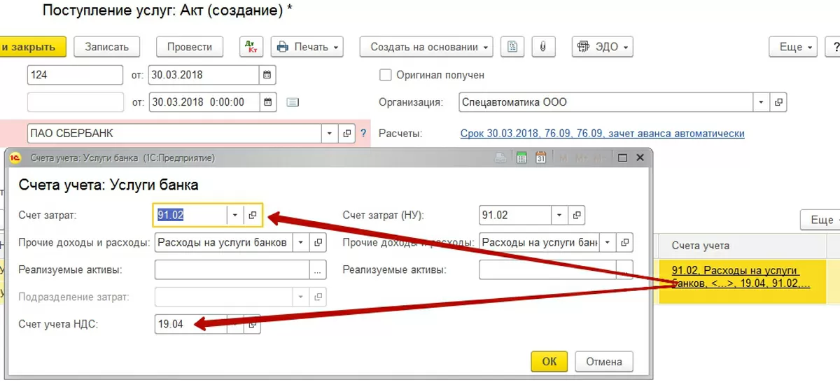 В счетах учета затрат отредактируем счет на 91.02 и заполним необходимую аналитику прочего расхода. Обратим внимание, что счет учета НДС автоматически установлен как 19.04.