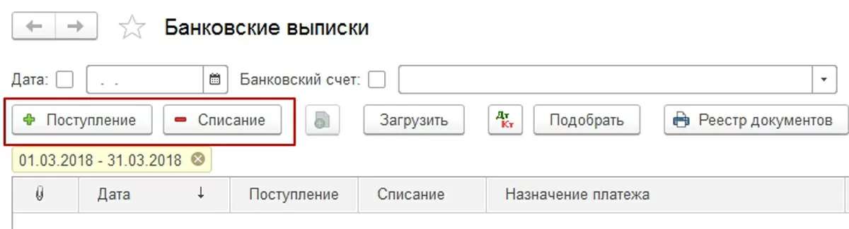 В журнале можно создавать два типа документов – поступление (+) и списание (-) на расчетном счете организации. Документы создаются нажатием на соответствующую кнопку.