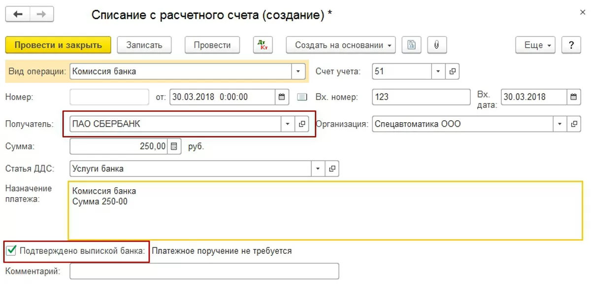 Особое внимание обратим на реквизит «Подтверждено выпиской банка», который установился по умолчанию. Только его установка позволит сформировать проводки после проведения документа.