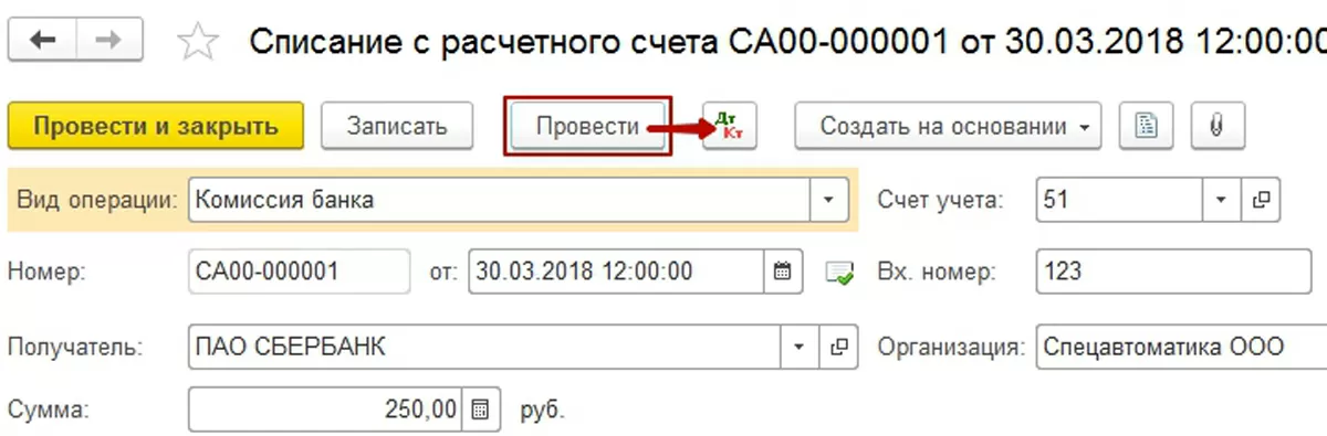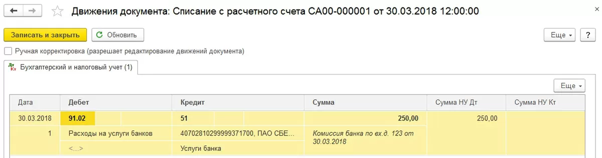 Проведем документ и посмотрим проводки по учету комиссии банка.