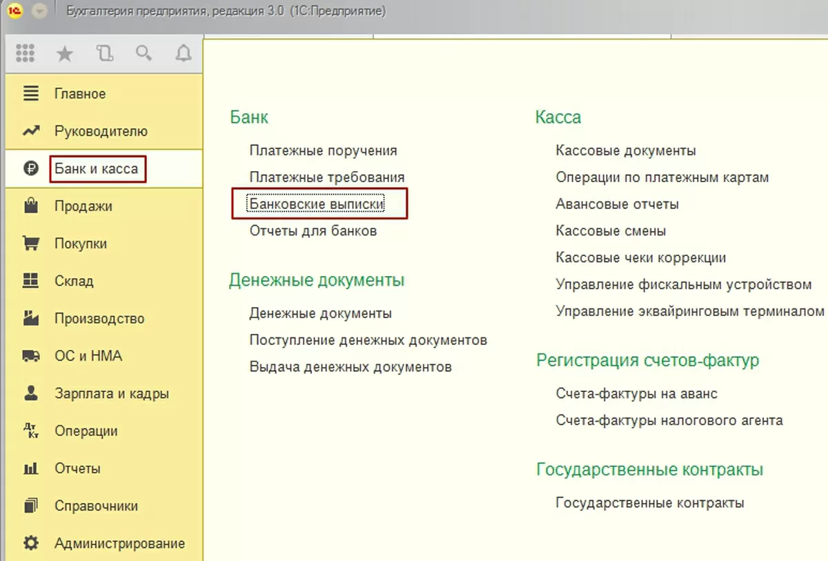 Из раздела «Банк и касса» основного интерфейса системы перейдем в журнал документов «Банковские выписки».