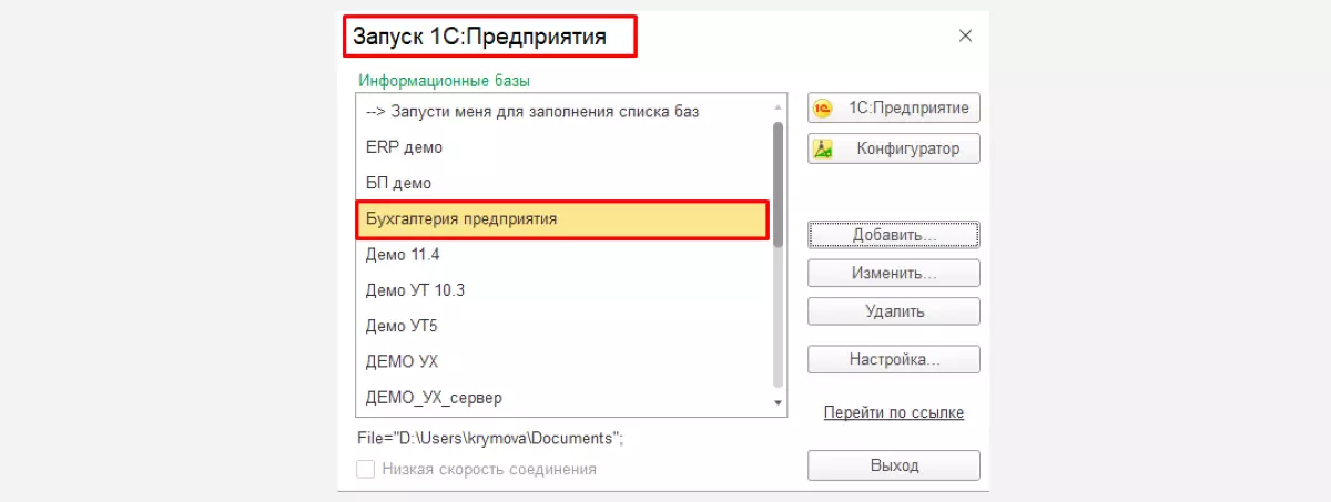 Шаблон конфигурации, в которой нам предстоит работа, создан. Далее ищем на рабочем столе или в меню «Пуск» ярлык 1С и запускаем его. Появляется окно со списком информационных баз.