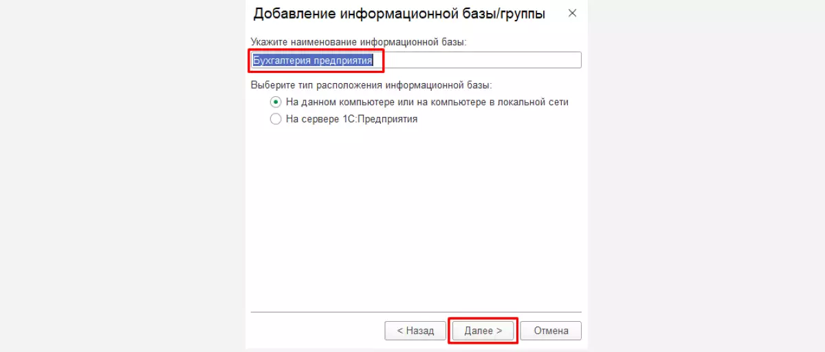 Программа предложит придумать название конфигурации. Это название будет отображаться в списке баз. Нажимаем «Далее».