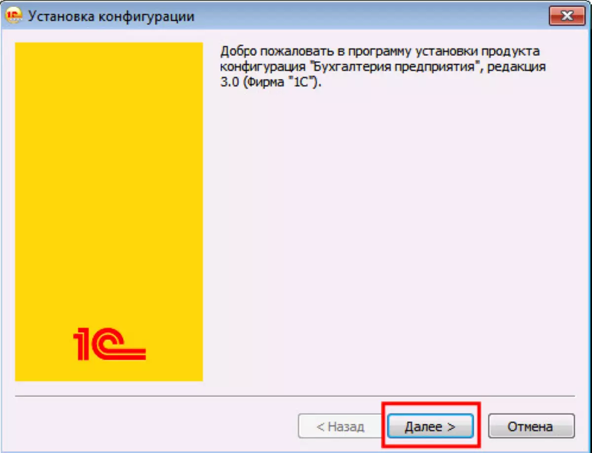 При установке конфигурации с диска рекомендуем воспользоваться автозапуском. Если автоматического запуска не произошло, необходимо открыть: «Мой компьютер/ Устройство чтения компакт-дисков», найти и запустить файл setup.exe. У вас появился окно запуска программы. Нажимаем кнопку «Далее».