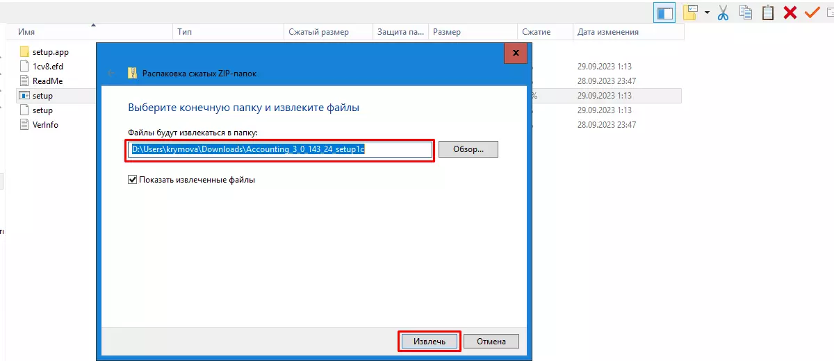 Быстрая установка 1С:Бухгалтерия. Подключимся через сервисы Ammyy Admin, AnyDesk, RDP, 1С-КоннектПри запуске дистрибутива, полученного у представителя обслуживающей компании или скачанного с сайта поддержки (для некоторых конфигураций разработчик выкладывает установочные дистрибутивы), вы видите архив, который надо распаковать, указав путь к папке, куда будут помещены распакованные файлы.