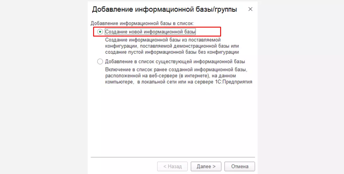 Выбираем пункт «Создание новой информационной базы» и нажимаем «Далее».