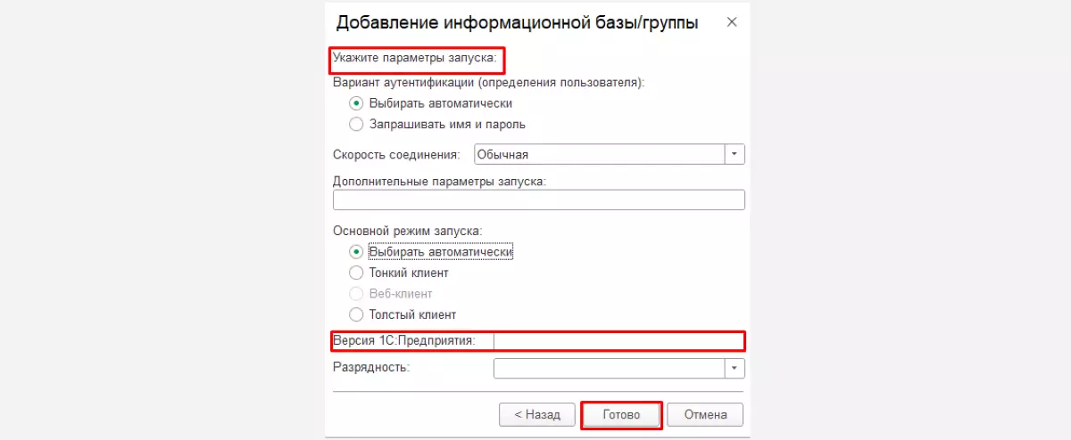 Далее следует окно, предназначенное для корректировки параметров запуска. Оставим параметры по умолчанию. Если на вашем компьютере ранее была установлена платформа 1С, то в пункте «Версия 1С:Предприятие» стоит указать версию платформы. Если в окне написать 8.2 или 8.3, то программа будет запускаться на последней найденной версии соответствующей платформы. Также можно указать версию платформы полностью. В этом случае конфигурация будет запускаться только под этой версией, невзирая на наличие других версий.