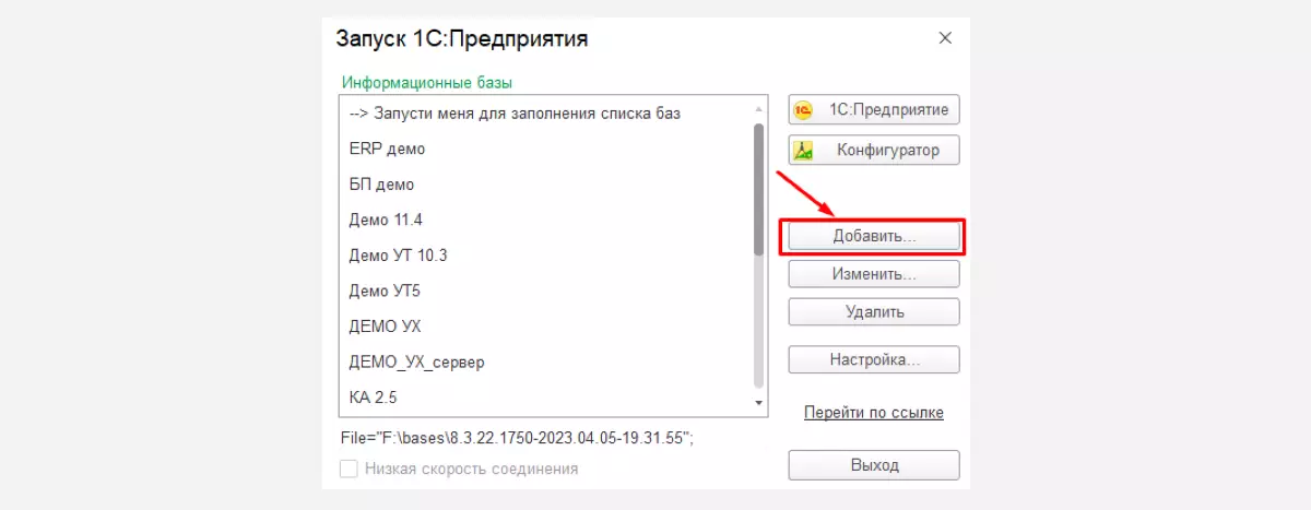 В случае, если создаете базу первый раз, список баз будет пуст и программа сама предложит вам создать новую базу. Если же, как в нашем случае, список баз не пуст, то создать новую базу можно, нажав кнопку «Добавить» в правой части окна.