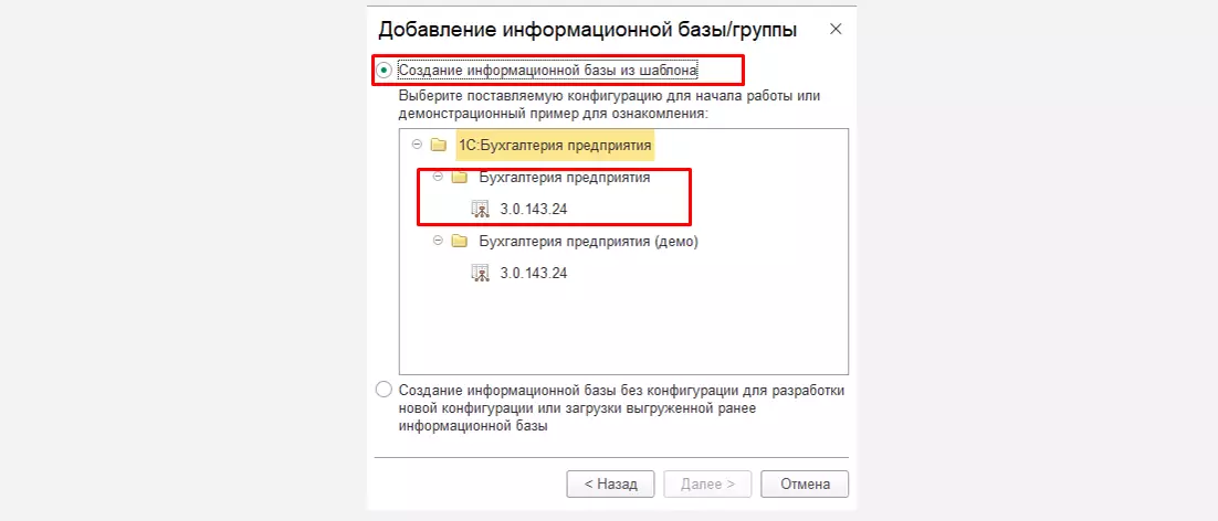 Здесь надо выбрать «Создание информационной базы из шаблона», а также установленную ранее версию конфигурации.