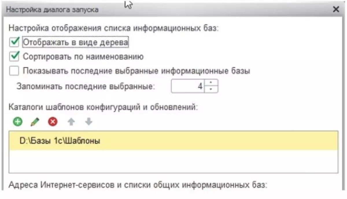 Если окно со списком шаблонов конфигурации пусто, то возвращаемся к списку баз и нажимаем кнопку «Настройка». Она находится там же, где кнопка «Добавить», чуть ниже.