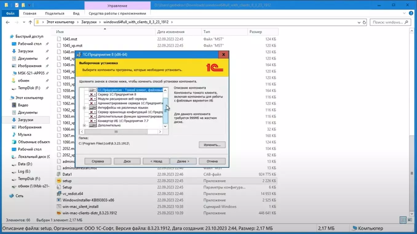 Далее нужно перейти в каталог и запустить установщик Setup.exe. При открытии помощника 1C, нажмите Далее и выберите компоненты для установки, язык и кликните Установить. Осталось только дождаться окончания процесса.