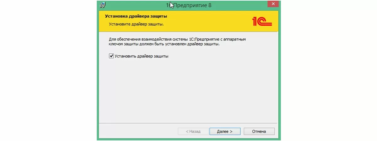Если вы приобрели версию 1С (USB), то не снимайте галочку. Если у вас версия с программной защитой, то можете ее убрать. Нажмите «Далее».