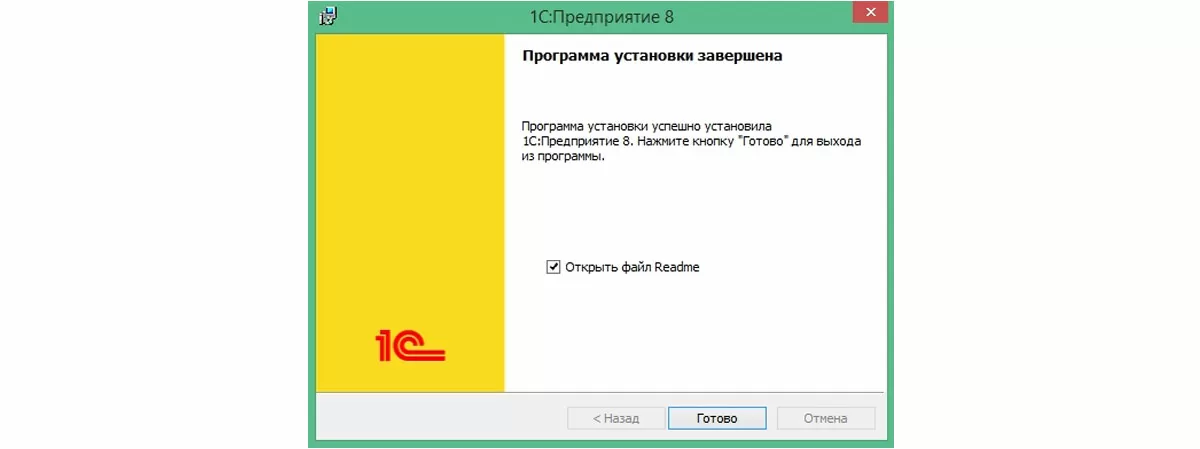 В следующем окне программа сообщит, что установка 1С:Предприятия завершена. Снимите галочку, если не хотите читать справочную информацию и нажмите «Готово».