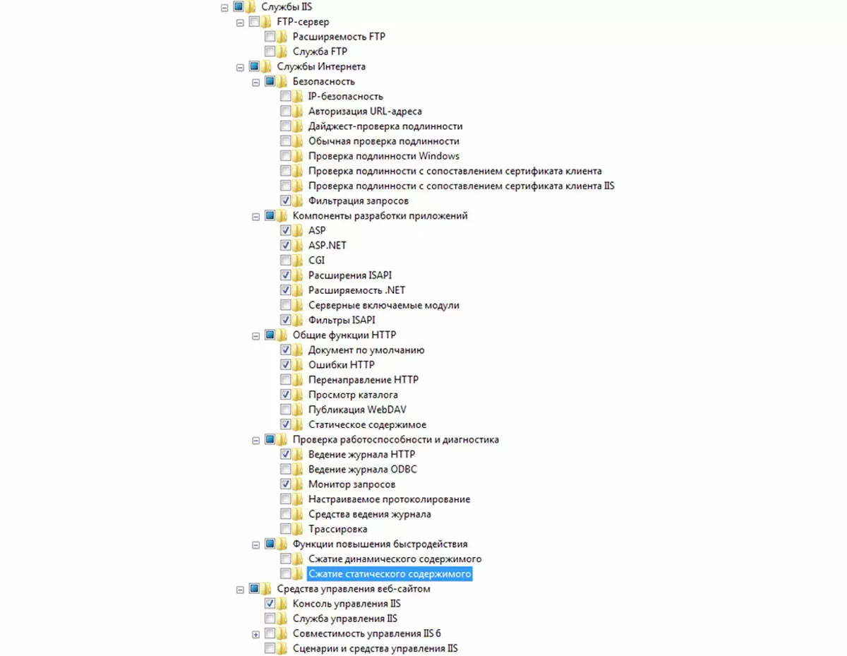 Чтобы начать настройку сервера зайдите в «Панель управления» -> «Программы и компоненты» -> «Включение или отключение компонентов». Найдите в дереве ветвь «Службы IIS/Службы интернета» и проставьте следующие галки:
