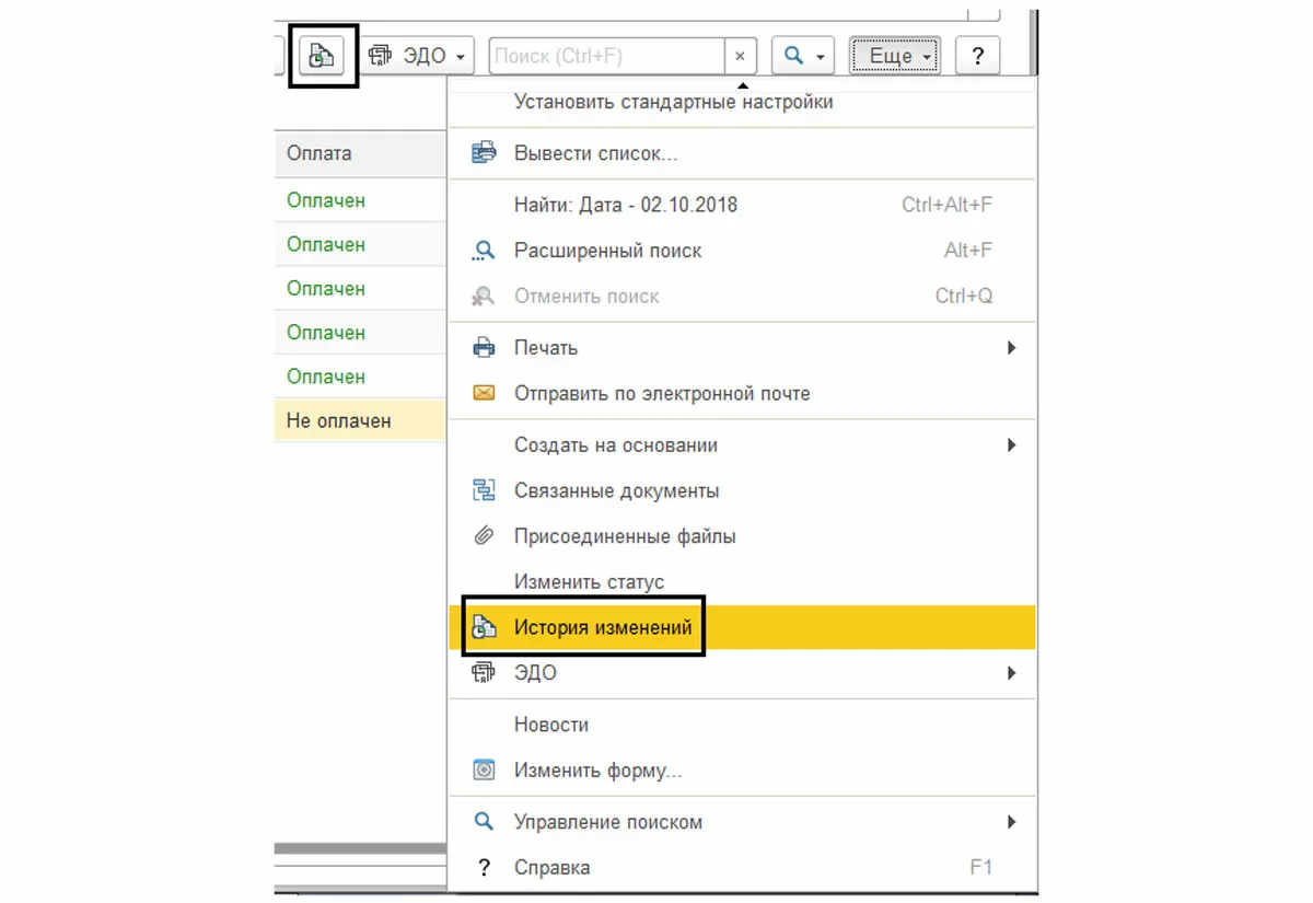 После активации данной настройки у объекта появляется дополнительный пункт в меню – «История изменений» (кнопка «Еще» в журнале документов), а также кнопка на панели инструментов «Перейти к отчету по версиям объектов».