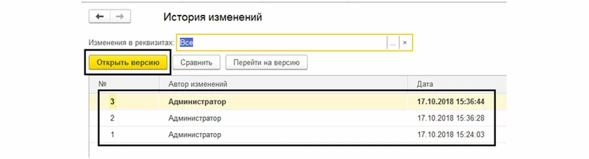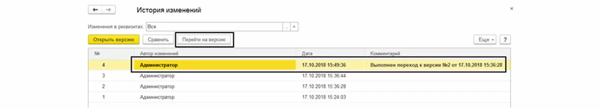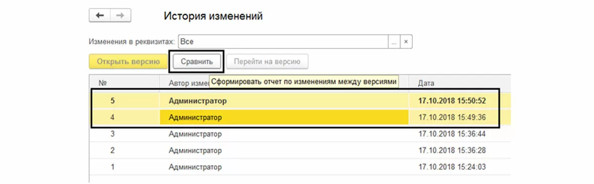 История изменений выглядит следующим образом: в открывшейся форме выводится список всех изменений объекта. Версию можно открыть или сравнить с любой из списка. Выбрать несколько строк можно с помощью кнопок «Shift» и «Ctrl».