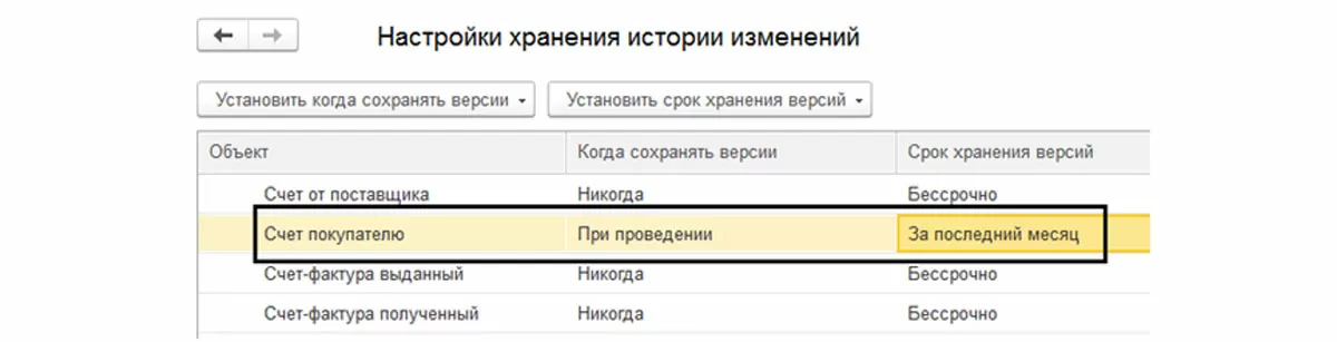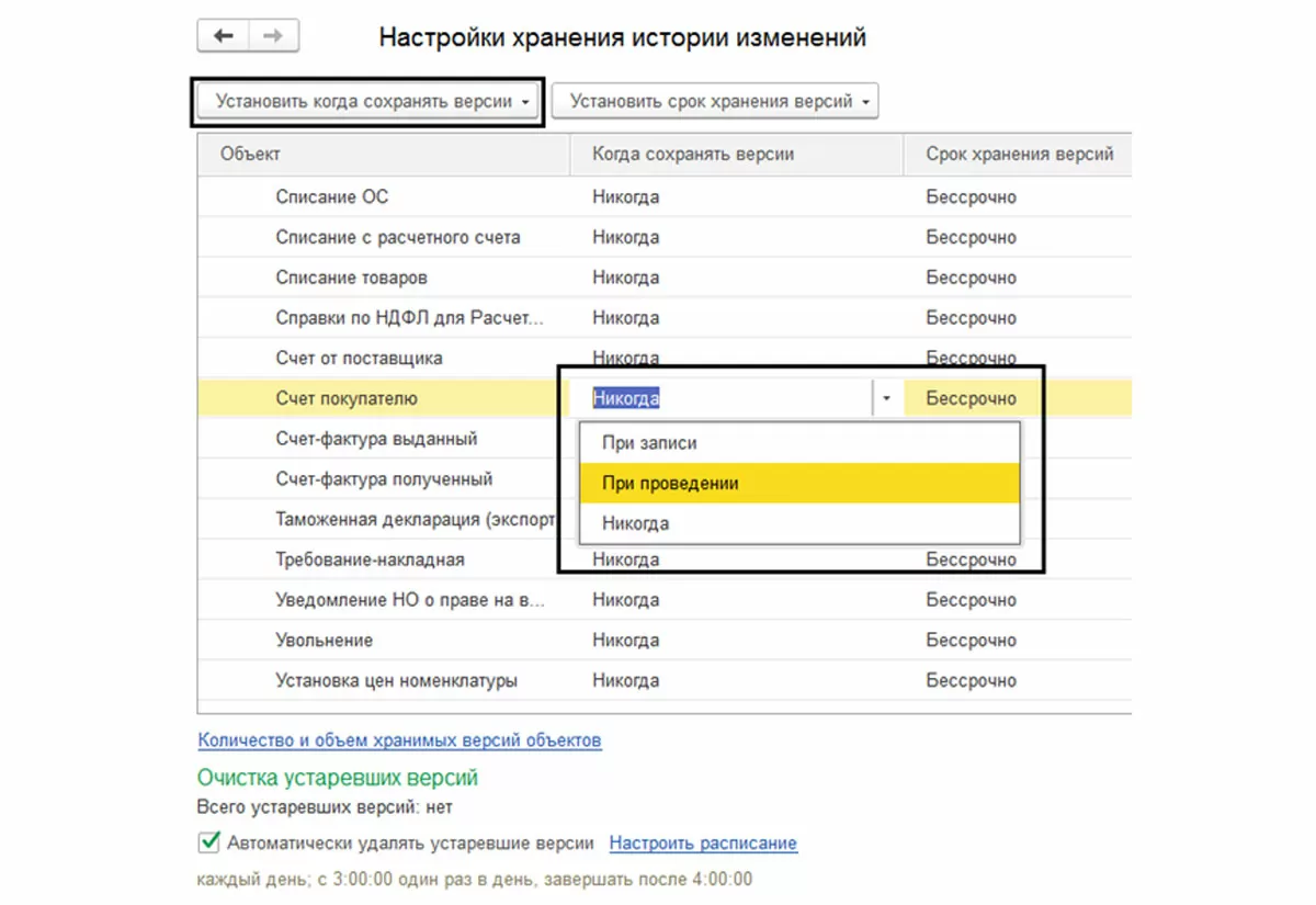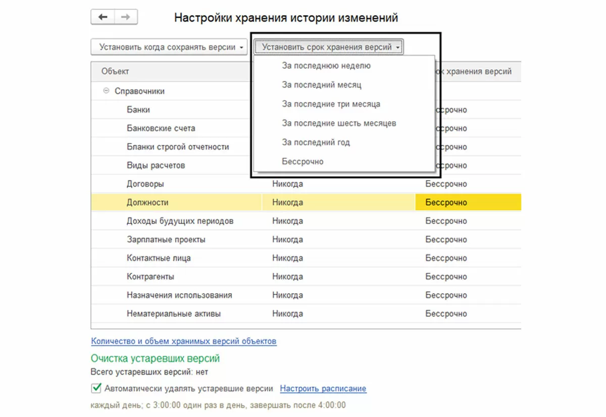 Чтобы механизм компактно хранил историю изменения данных пользователя, и не вышло так, что история изменения объектов занимает больше места, чем сами объекты, и в результате функционал приводит к замедлению работы программы, необходимо правильно выполнить настройку этого механизма.