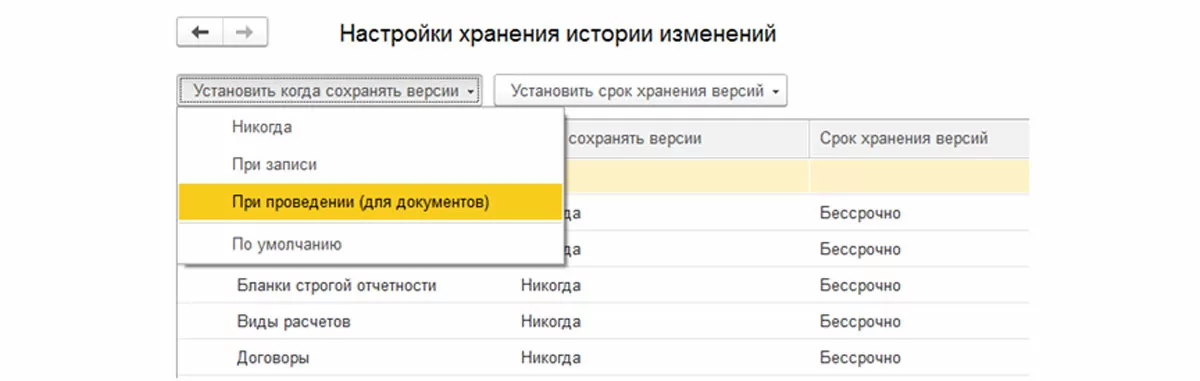 С помощью кнопки «Установить когда сохранять версии» мы можем установить когда сохранять версию – «Никогда», «При записи», «При проведении» или «По умолчанию». Настройка «По умолчанию» предполагает рекомендуемые настройки: для справочников – «Никогда» не создавать версии, для документов – «Создавать версии при проведении», для бизнес-процессов – «Создавать версии при старте». Настройка выполняется для всех объектов, но целесообразнее выполнить настройку отдельно для каждого объекта в списке.