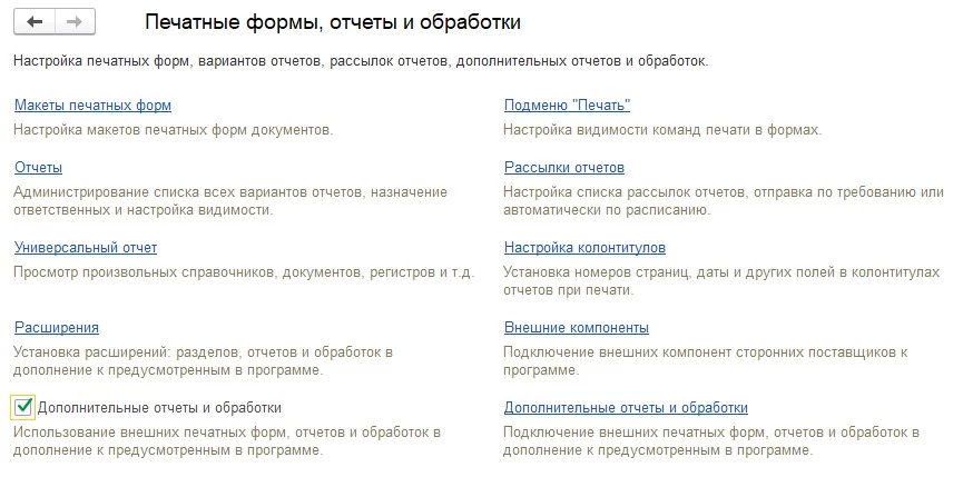 Активировать функциональную опцию Дополнительные отчеты и обработки.