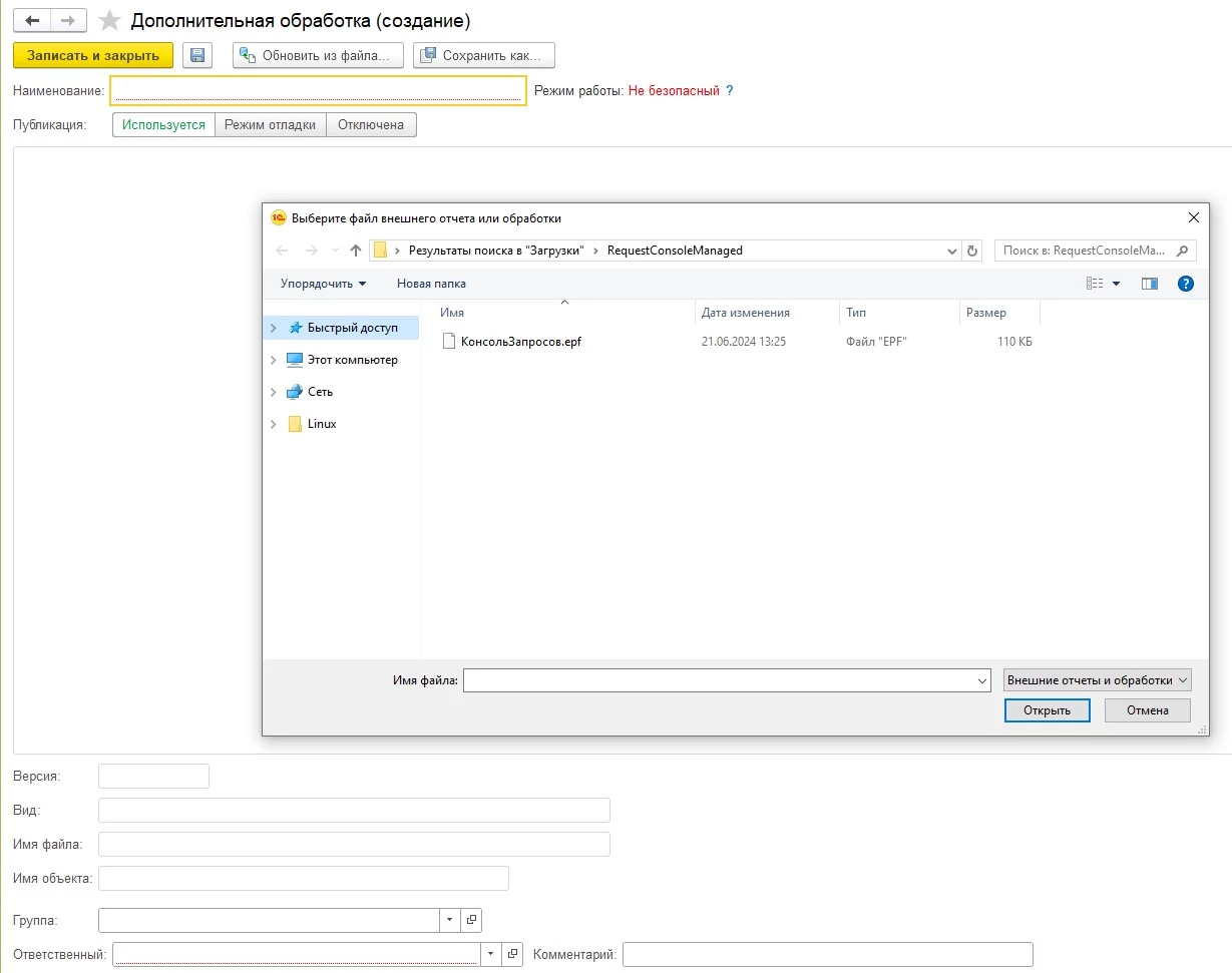 Во вкладке Дополнительные отчеты и обработки добавить новую обработку через Добавить из файла....