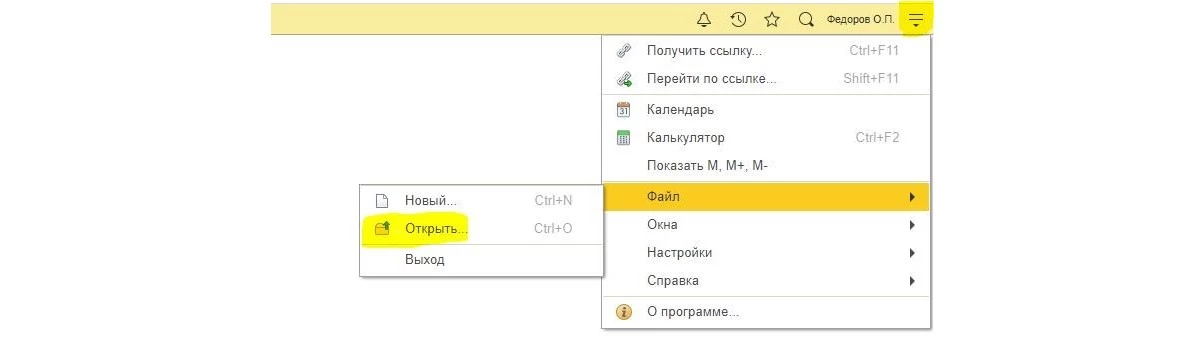Чтобы открыть внешнюю обработку файла в режиме 1С:Предприятие, надо выбрать Файл – Открыть использовать сочетание Ctrl+O.