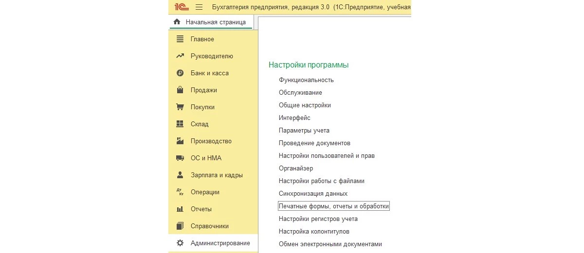 В подсистеме Администрирование перейти во вкладку Печатные формы, отчеты и обработки.