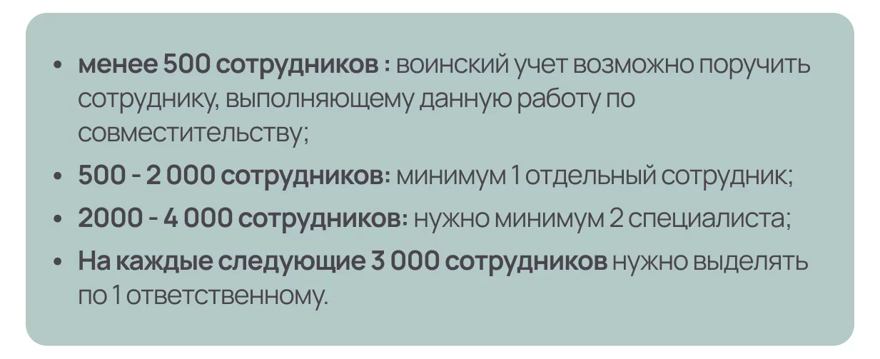 Согласно Положению о воинском учете, существуют четкие требования к назначению ответственных, зная количество работников по состоянию на конец предшествующего года (31 декабря):