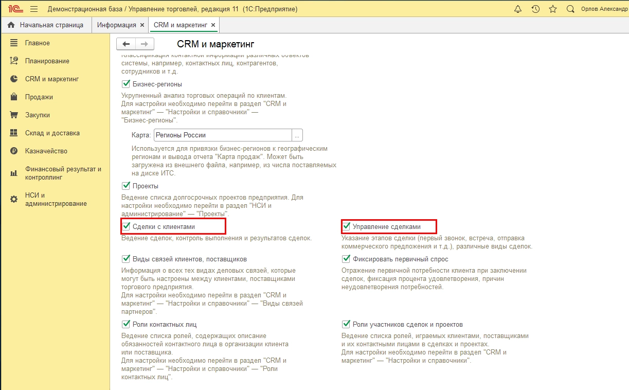 Включить возможность оформления сделок с клиентами можно в разделе «НСИ и администрирование-Настройка НСИ и разделов-CRM и маркетинг». Для этого необходимо установить галочки – «Сделки с клиентами» и «Управление сделками».