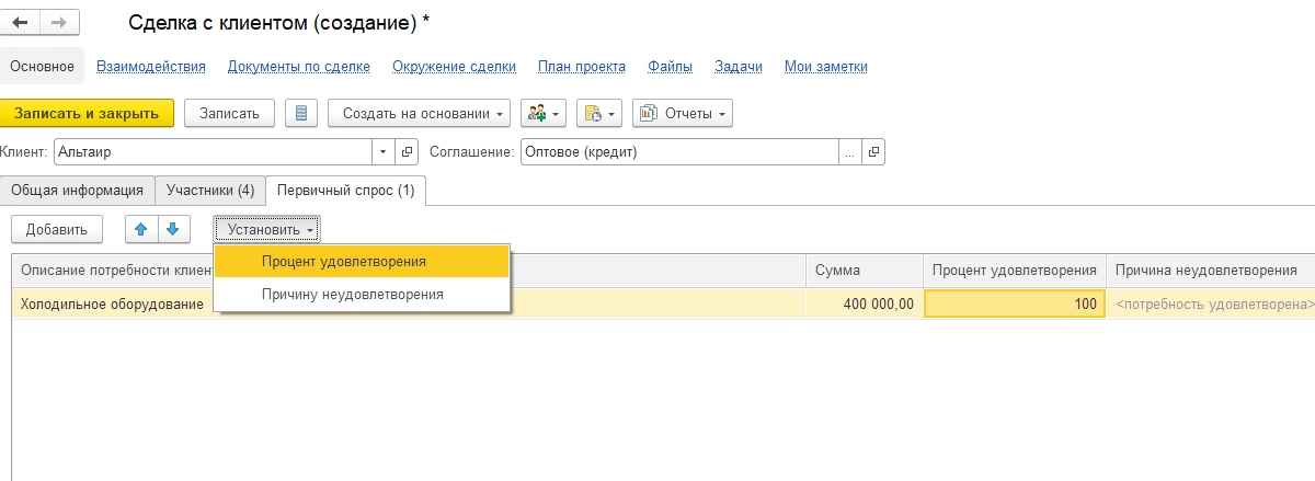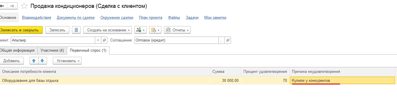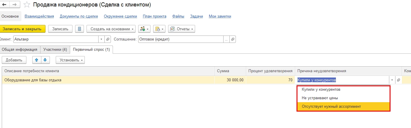 На данном этапе выясняется ситуация удовлетворения первичного спроса, для подготовки перехода к следующему этапу – что клиент хочет купить, по каким ценам, нет ли проблем с поставками данного товара и т.п. При неудовлетворении спроса по каким-либо причинам делается отметка в карточке сделки.